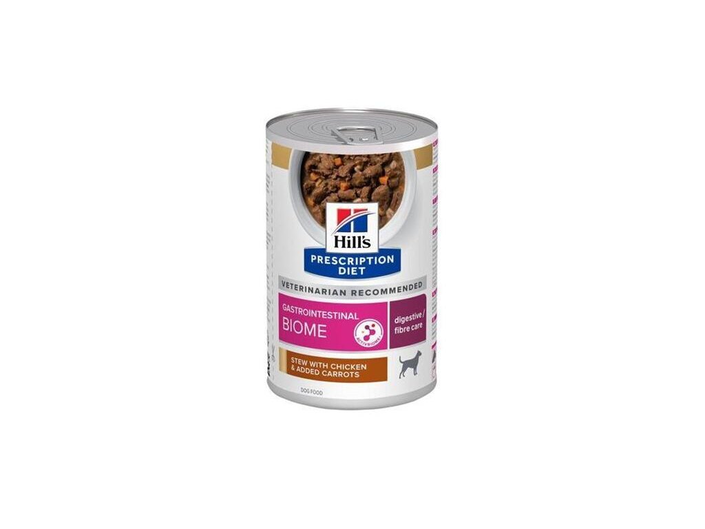 Hill's PRESCRIPTION DIET Gastrointestinal Biome Stew krmivo pre psov s kuraťom a pridanou mrkvou je vysoko stráviteľné kompletné dietetické krmivo používané na zmiernenie porúch vstrebávania živín v črevách a na kompenzáciu zlého trávenia u dospelých psov. Toto krmivo obohatené o vlákninu má zvýšený obsah sodíka a draslíka a obsahuje vysoko stráviteľné prísady.